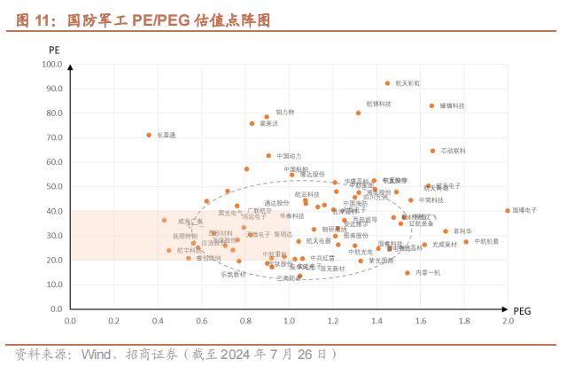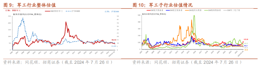 军工行业估值具备配置价值。以国防军工指数(申万)和国防军工指数(中信)为例,年初截至2024年7月26日,国防军工指数(申万)下跌8.74%,目前行业PE(TTM)估值为48.43倍,5年分位点3.92%;国防军工指数(中信)年初至今下跌8.71%,目前行业PE(TTM)估值为65.41倍,5年分位点32.75%。我们认为,在目前军工行业景气度已得到全面验证的情况下,当前估值的军工行业具备较大的配置价值。