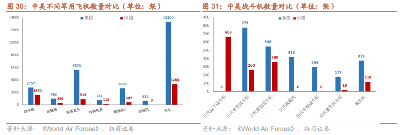 我国军用航空装备缺口大,更新换代需求强烈。根据《World Air Forces》统计数据,从数量和结构上看,中美两国的航空装备都存在着相当大的差距。从数量上看,中国各个机型的飞机数量都与美国有较大差距,特别是战斗直升机、运输机、空中加油机、特种飞机四大类别中存在不止一个数量级的差距。从结构上看,中国目前战斗机仍以相对落后的二代机为主,而美国则均为三代机及以上,并仍在不断提升四代机的数量、改善战机结构。