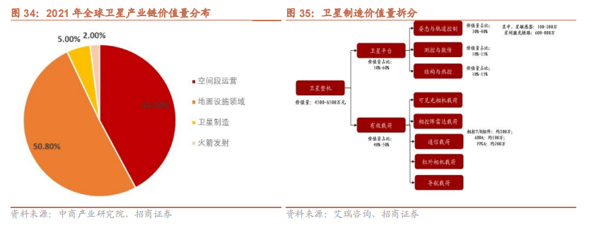 卫星整机制造分为卫星平台和有效载荷两部分,其价值量约各占50%,卫星平台中包括姿态与轨道控制、测控与数传、结构与热控等组成部分;有效载荷则分为可见光相机载荷、相控阵雷达载荷、通信载荷、红外相机载荷以及导航载荷等。