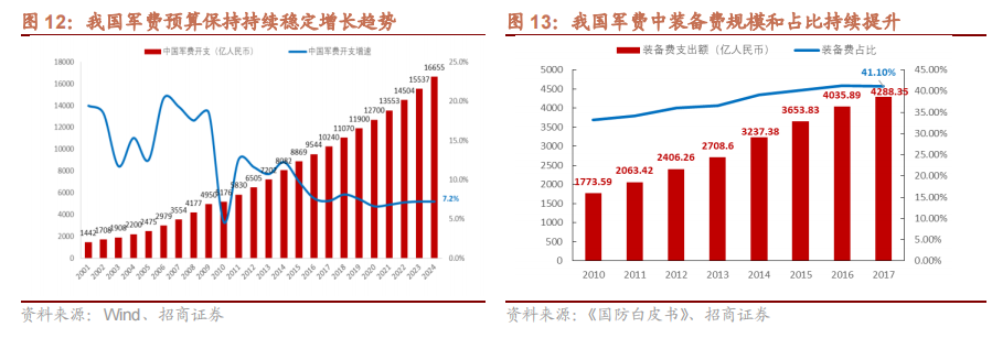 1)国防军费:2024年3月5日,根据第十四届全国人民代表大会第二次会议上提交的预算草案显示,2024年全国财政安排国防支出预算为16655.4亿元人民币,同比增长7.2%,增幅较去年持平;我国近年军费支出增速保持增长,并在高位维持。另外,根据二十届三中全会的《中共中央关于进一步全面深化改革 推进中国式现代化的决定》,未来将持续深化国防和军队改革,改进武器装备采购制度,建立军品设计回报机制,构建武器装备现代化管理体系。加强航天、军贸等领域建设和管理统筹。2)军贸市场:世界安全局势风雨飘摇,军贸市场或再度扩容,格局变化提供窗口期。持续一年多的俄乌冲突仍在进行当中,巴以冲突令世界局势再起波澜。我们认为,在世界安全局势趋于紧张的背景下,军贸市场在冲突中重启扩张态势,或将持续扩容。竞争格局方面,俄乌冲突等带来了军贸出口格局的变化可能,格局变化也为中国军贸的出口带来了窗口期。“中国力量”也逐渐展露,运-20BE、枭龙Block3版本、L15教练机等亮相迪拜航展,直10ME武装直升机真机首次亮相新加坡航展。