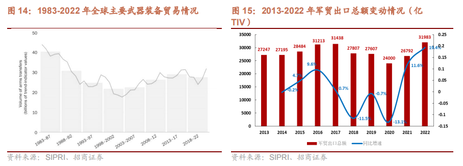 世界安全局势风雨飘摇,军贸市场或再度扩容,格局变化提供窗口期。持续一年多的俄乌冲突仍在进行当中,世界局势再起波澜。2023年10月7日,巴勒斯坦伊斯兰抵抗运动(哈马斯)从加沙地带向以色列发动突袭。当天,以色列总理内塔尼亚胡宣布该国进入“战争状态”。另外,巴以冲突的战火逐渐烧至周边国家。10月12日,以色列空袭叙利亚大马士革国际机场与阿勒颇机场。我们认为,世界安全局势呈现风雨飘摇的态势,军贸市场在冲突中重启扩张态势,或将持续扩容。竞争格局方面,俄乌冲突等带来了军贸出口格局的变化可能。