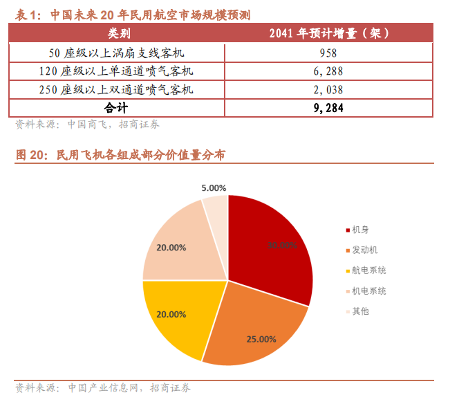 国产C919开启商业运营,打开万亿大飞机市场。2023年5月28日,东方航空mu9191航班平稳降落在北京首都国际机场,执飞这一航班的是全球首架交付的国产大飞机C919——我国首次按照国际通行适航标准自行研制、具有自主知识产权的喷气式干线客机,这标志着该机型正式进入民航市场,开启市场化运营、产业化发展新征程。根据中国商飞公司发布的《中国商飞公司市场预测年报(2022-2041)》预测,未来20年中国的旅客周转量年均增长率为5.6%,机队年均增长率为5.1%。未来二十年,中国航空市场将接收50座级以上客机9,284架,价值达1.46万亿美元(以2021年目录价格为基础)。其中50座级以上涡扇支线客机958架,120座级以上单通道喷气客机6,288架,250座级以上双通道喷气客机2,038架。