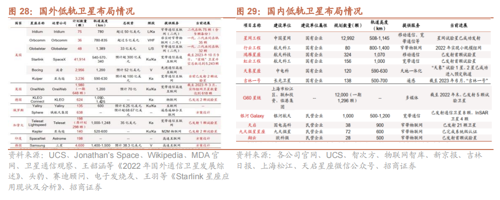 低轨卫星轨道容量有限,各国加紧布局战略资源。由于卫星轨道和频谱资源十分有限,世界各国已充分意识到近地轨道和频谱资源的战略价值,以及低轨卫星通信系统的巨大商业价值,近年来悄然开展卫星发射争夺战。据推算,地球 LEO 轨道预计可容纳约 6-8 万颗卫星, 2029 年预计地球近地轨道将部署约 5.7 万颗卫星。ITU 对于低轨卫星及频段采取“先占先得原则”,目前 Ku 及 Ka 黄金通信频段资源也逐渐趋于饱和状态,空间卫星频率和轨道资源将更加稀缺。SpaceX-Starlink总计规划4.2万颗卫星,分布在KA、KU、E频段。我国“星网”总规划1.29万颗卫星,分布在 KA 和频率更高的V频段。