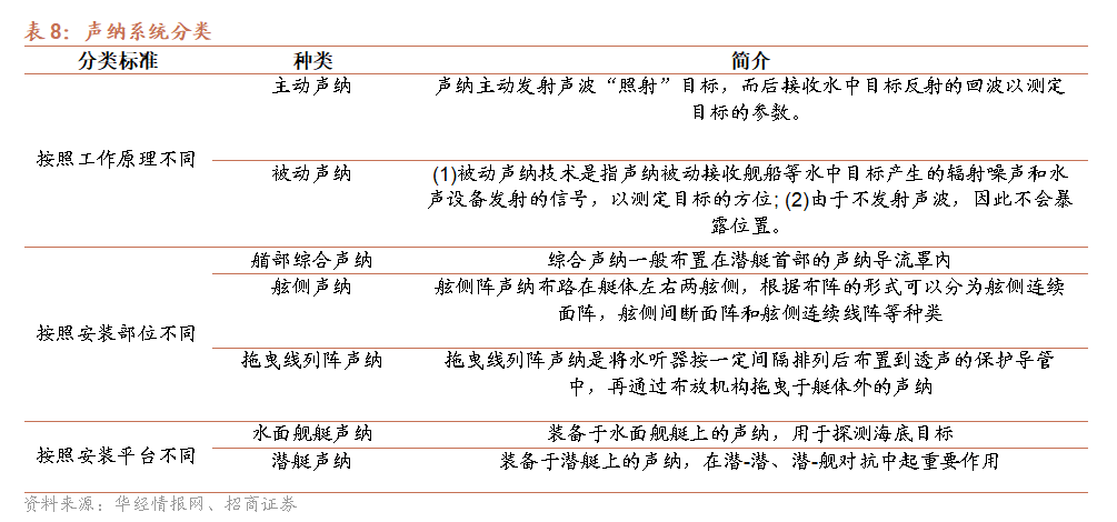 根据工作体制的不同,可将舰载声纳分为主动声纳和被动声纳;根据安装部位的不同可分为艏部综合声纳、舷侧声纳和拖曳线列阵声纳;按照安装平台的不同又可分为水面舰艇声纳和潜艇声纳等。