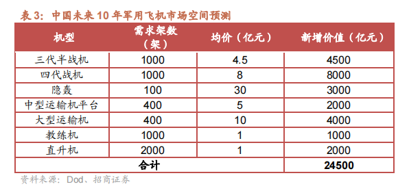 未来10年我国军用新机交付市场空间将达到年均2450亿元,复合增速约9.5%。参考美国当前各机型数量和结构情况,并考虑到我国当前歼-20、直-10C、运20等新型作战飞机与非作战飞机持续列装部队,预计中国在未来10年合计将新增5900架军机,军用航空新增市场空间将达到24500亿元,年均2450亿元。根据估算,2023年各飞机主机厂合计收入约1807.6亿元,假设其中民品、维修占比约20%,则23年新机交付收入为1446亿元,按未来10年我国军机新增市场空间24500亿元计算,未来10年我国军机新增市场营收端复合增速约为9.5%。