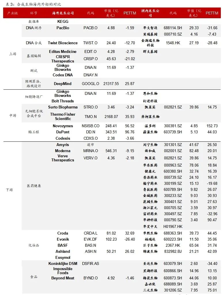关注具备成本领先或产品高附加值/产业化实力强的细分方向。在投资合成生物的时候,我们认为需要考虑到1)技术的复杂性,以及到推广(产生颠覆性作用)所需的成本时间;2)合成生物产品的经济替代可能性,以及产能限制;3)政策与专利等因素。作为早期概念性的主题投资机会,我们一方面看好高壁垒的技术路径,如基因编辑与治疗;从全球一级市场投融资来看,健康医药是资本关注较多的板块,例如AbCellera(上市,AI制药)、ElevateBio(C轮5.25亿美元、基因疗法)、Verve Therapeutics(上市、基因编辑)等公司近年获得大额融资,反映出可观的商业前景,但这在二级市场中更偏向于概念。另一方面,我们认为应关注产业化落地能力强的赛道,尤其是在海内外商业模式已经跑通的龙头公司,Amyris龙头破产等海外经验也印证了商业模式的重要性。