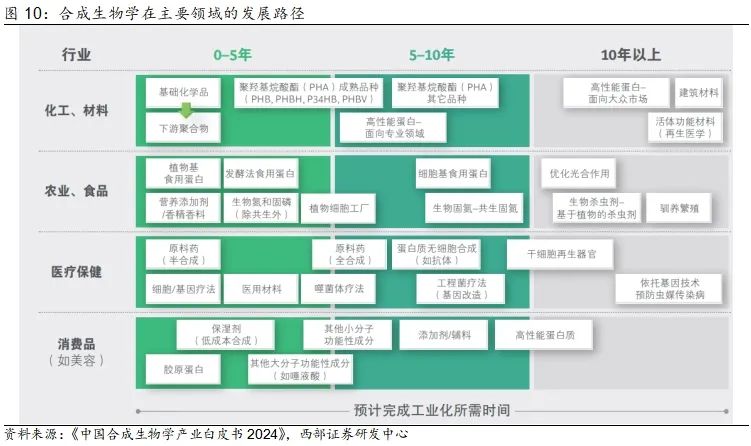 合成生物的投资机会更多在下游,近端可验证的机会跨越化工、医药、医美等核心行业。合成生物学产业链包括上游使能技术开发(CRISPR等)、中游平台赋能公司(Gingko Bioworks、诺维信等)与下游产品研发与应用。从商业化发展的路径来看,合成生物近期(5年)的应用成果更多为化学品、食品(替代蛋白)、创新细胞基因疗法/原料药合成,以及重组胶原蛋白等。中期(10年)如农业的共生固氮技术、工程菌疗法等;远期(>10年)则有望在活体功能材料、生物质燃料等领域实现工业化。根据《中国合成生物产业白皮书2024》中CB Insights和B Capital分析,全球合成生物市场规模预计在2028年将达到近500亿美元(年均增长24%)。