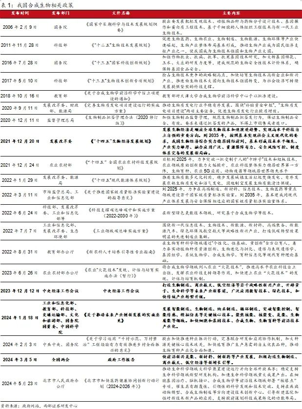 我国促进合成生物多领域发展,大力发展生物经济。在《国家创新驱动发展战略纲要》《“十三五”国家科技创新规划》《“十三五”生物产业发展规划》《国家生物技术战略发展纲要》,以及《“十四五”生物经济发展规划》中,均对合成生物学的技术创新和产业发展进行了战略布局和规划。《“十四五”生物经济发展规划》要求到2025年,生物经济成为推动高质量发展的强劲动力,总量规模迈上新台阶,产业融合发展实现新跨越;要求到2035年,我国生物经济综合实力稳居国际前列,基本形成技术领先、产业完整、应用广泛、制度完备的发展新局面。2018年我国启动首个国家重点研发计划“合成生物学”重点专项。中央经济工作会议&2024政府工作报告提出“以科技创新引领现代化产业体系建设”为首要任务,即发展新质生产力,其中重点提及了“打造生物制造、商业航天、低空经济等若干战略性新兴产业,开辟量子、生命科学等未来产业新赛道”。《关于推动未来产业创新发展的实施意见》明确提出加快细胞和基因技术、合成生物、生物育种等前沿技术产业化,推动5G/6G、元宇宙、人工智能等技术赋能新型医疗服务,研发融合数字孪生、脑机交互等先进技术的高端医疗装备和健康用品。2024年5月23日,北京发布《北京市加快医药健康协同创新行动计划(2024-2026年)》,其中多项内容就涉及合成生物学,后续各地政策有望跟进。