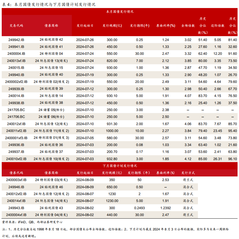 国债发行规模较上月下降。7月1日-7月31日共发行国债18只,合计发行规模9924.9亿元,较上月下降2891.5亿元,其中发行期限1年及以内的占比为31.54%。7月财政部发行了30年期特别国债(24特别国债04),全场倍数为3.32倍,边际倍数为12.20倍;续发了一期30年特别国债与一期20年特别国债。下月计划发行6只国债,发行规模合计4200亿元。