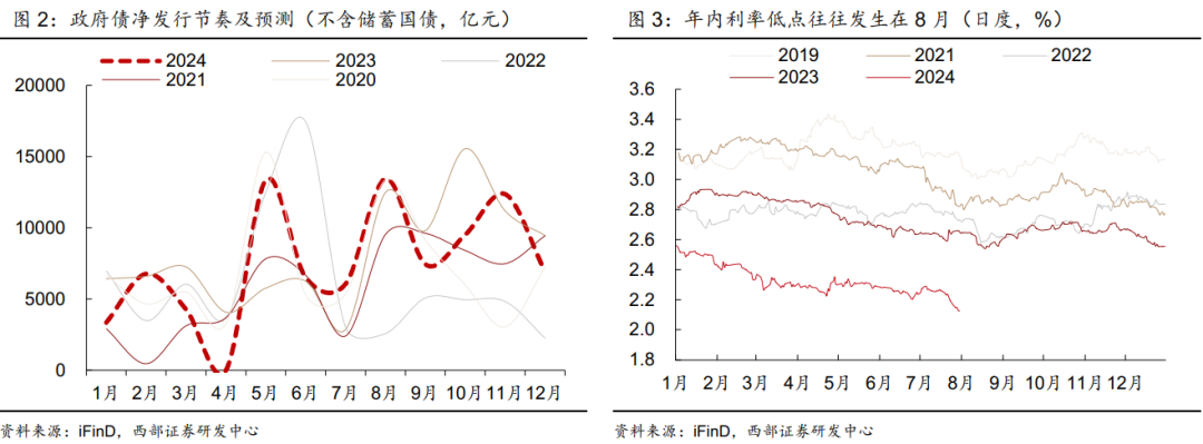 3、8月债市利空因素主要是政策预期、供给与季节性因素,但影响可能较为有限。政策预期方面,宏观政策力度若超预期对债市形成利空,但我们预计增量政策可能是结构性的、相机抉择的,强刺激概率不大。供给方面,我们预测8月政府债供给环比回升、同比或略高于去年8月,但预计央行可能通过降准、加大OMO投放量来对冲。季节性因素方面,2019、2022、2023年的年内利率低点分别发生在8/13、8/16、8/19日之后利率纷纷上行,而2021年前11月利率低点发生在8/3之后利率上行、12月末又突破了前低。