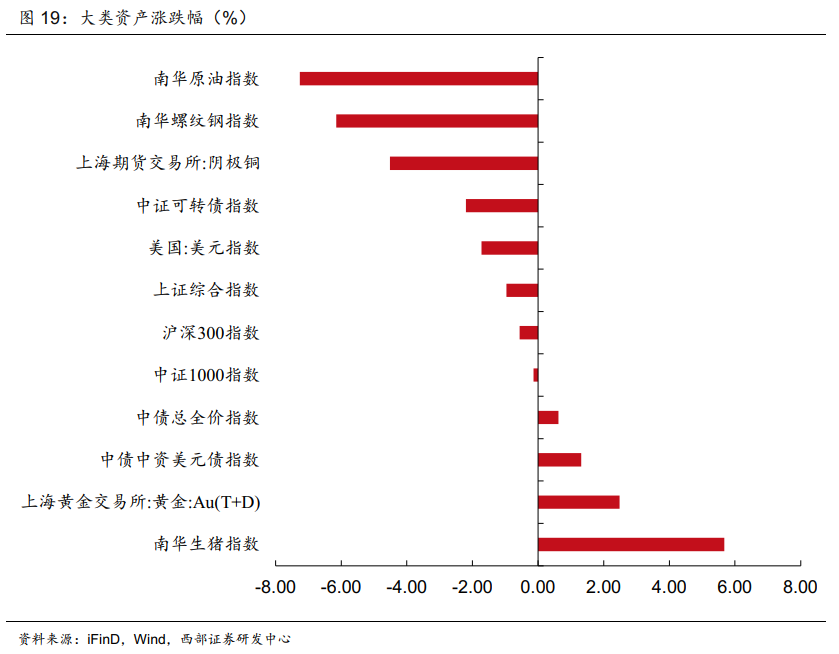 大类资产表现:生猪>沪金>中债>中证1000>沪深300>美元>可转债>沪铜>螺纹钢>原油。