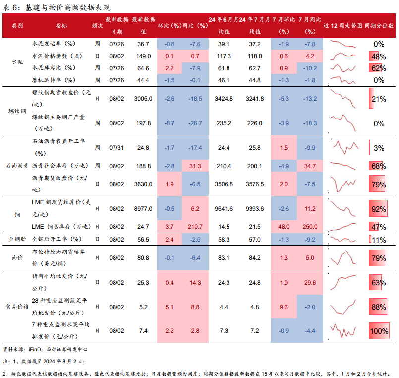 7月基建高频生产同比下降,LME铜库存月均值保持较大增幅,价格环比上升较多。从7月以来的基建高频数据表现来看,生产指标月均值同比下降,且除石油沥青装置开工率外其余指标月均值环比均下降;水泥库容比月均值环比升同比降,沥青社会库存月均值环比降同比升,LME铜库存月均值环比同比均升;价格指标中,螺纹钢、LME铜和水果月均值环比下降,其余价格指标月均值环比上升。