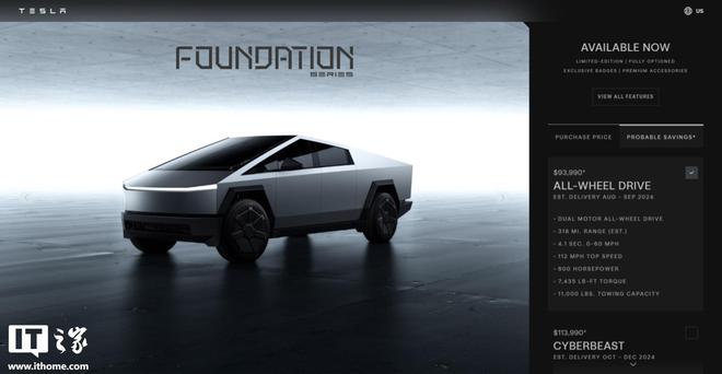 IT之家注意到,消费者现在可以通过特斯拉美国官网的车辆配置器直接购买 Cybertruck 基础版,页面还显示双电机全轮驱动版预计在 9 月交付,三电机 Cyberbeast 版本预计在 12 月交付。