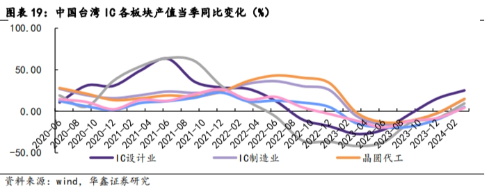 中国台湾IC各板块产值同比增速自2021年以来持续下降,从2023年Q2开始陆续有所反弹,各板块产值降幅均有所收窄。IC板块整体表现不佳,主要因为消费电子需求差,导致IC设计下滑,加之2021年缺货、涨价导致的2022年库存水位上升。但随着AI、5G、汽车智能化等应用领域的推动,2024年需求开始逐步回升。