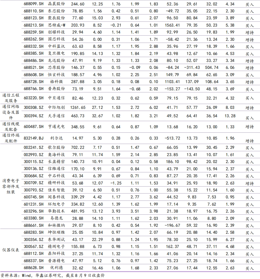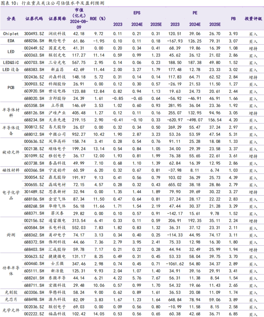 行业重点公司估值水平和盈利预测