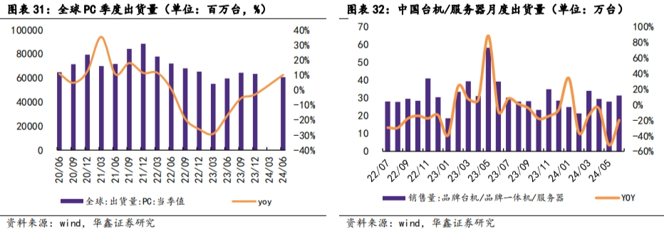 个人电脑方面,2024H1,全球PC出货量同比上升10.04%,扭转了2022年下半年以来的下降趋势。回顾历史,2020-2021年疫情带来居家办公需求快速上升,推动PC重回增长轨道,但疫情带来的短期复苏结束后PC重回弱势趋势,在2022Q2开始进入下行区间,2022Q2全球PC出货量同比微增0.53%,远低于Q1的11.44%的增速,2023H1,全球PC出货量继续下降,一季度同比下降29.16%,二季度同比下降17.16%;2023Q3,出货量同比下降5.47%,降幅有所收窄;2023Q4,出货量同比下降2.94%,降幅进一步收窄。2023年,品牌台机/品牌一体机/服务器出货量累计达392.58万件,同比增长2.62%。AI大模型落地给PC产业链带来新的创新驱动力,另外PC换机潮的到来,预计2024年PC市场将恢复增长。