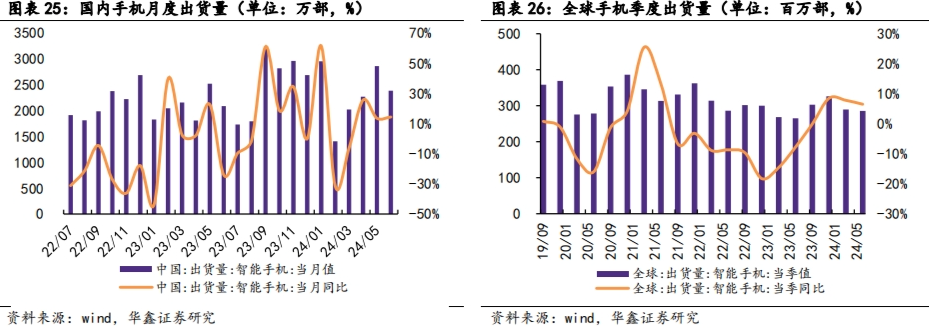 2023H2,国内智能手机出货量同比转正。2024年6月国内手机出货量同比增长14.3%。全球范围内,2023年智能手机出货量同比下滑3.3%,但分季度来看,全球智能手机出货量前三季度同比降幅逐季收窄,2023年四季度同比变动转正,2024年二季度全球手机出货量维持上升,同比增长6.5%。主要由于两个方面,一方面是手机硬件缺乏创新,发达经济体以及中国5G周期结束后,消费者换机周期拉长;另一方面中国疫情之后经济复苏不及预期,消费者需求疲软。