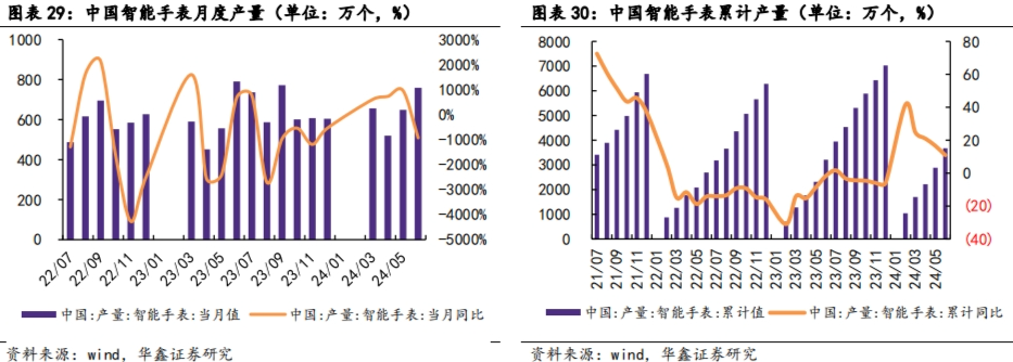 中国智能手表 2023 年全年累计产量同比下降 5.90%;但进入 2024 年之后出现反弹,第一季度智能手表累计产量同比增长 24.7%,打破近两年的持续下滑趋势,增长态势有望持续。展望 2024 年,随着生成式 AI 与终端硬件的结合,智能手表有望集成更多 AI 功能,从而为市场增长开辟新途径。