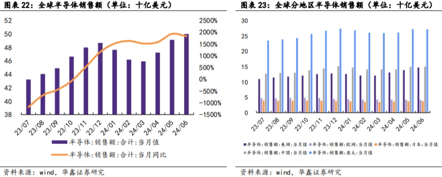 全球半导体销售额 2023 年 H1 整体呈同比下降态势。2024 年 6月,全球半导体当月销售额为 499.8 亿美元,同比增长 18.3%,其中中国销售额为 150.9 亿美元,环比增长 0.8%,占比达 30.2%。此外,从 2023 年 6 月开始全球半导体当月销售额逐月递增,直至 2023 年11月份开始全球半导体销售额同比变动转正并持续扩大。