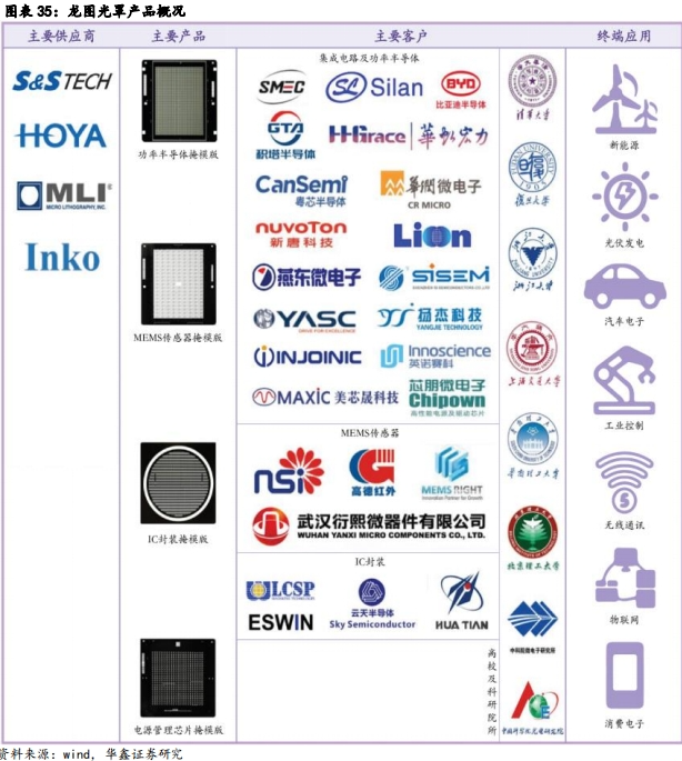 公司紧跟国内特色工艺半导体发展路线,不断进行技术攻关和产品迭代,半导体掩模版对应下游半导体产品的工艺节点从1μm逐步提升至 130nm,产品广泛应用于功率半导体、MEMS 传感器、IC 封装、模拟IC等特色工艺半导体领域,终端应用涵盖新能源、光伏发电、汽车电子、工业控制、无线通信、物联网、消费电子等场景。公司已掌握 130nm 及以上节点半导体掩模版制作的关键技术,形成涵盖CAM、光刻、检测全流程的核心技术体系。在功率半导体掩模版领域,工艺节点已覆盖全球功率半导体主流制程的需求。