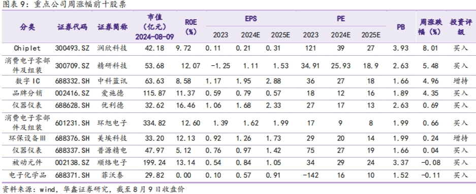 8月5日-8月9日当周,重点关注公司周涨幅前十:消费电子零部件及组装、仪器仪表分别占两席,Chiplet、电子化学品、数字IC、被动元件、环保设备Ⅲ、品牌分销各占一席。润欣科技(Chiplet)、精研科技(消费电子零部件及组装)、中科蓝讯(数字IC)包揽前三,周涨幅分别为8.01%、5.48%、4.96%。
