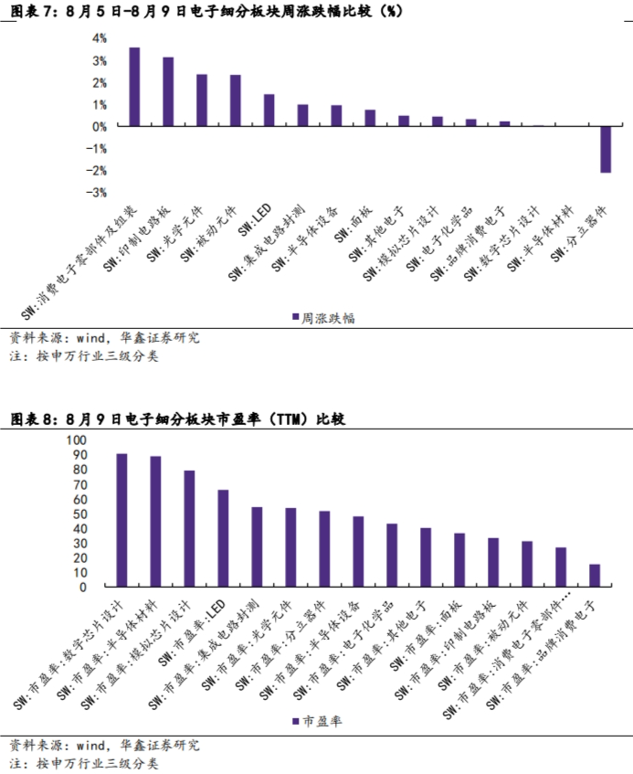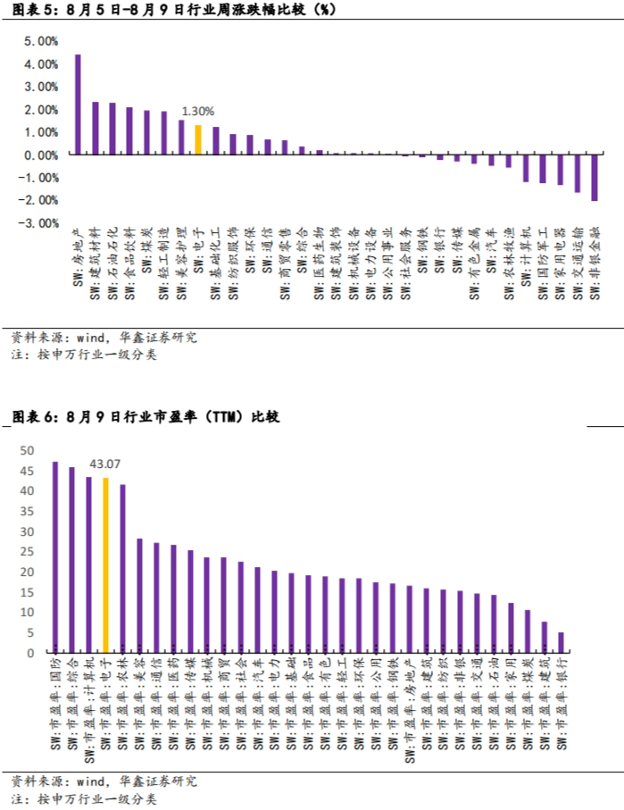 8月5日-8月9日当周,申万一级行业普遍处于分化的状态。其中电子行业上涨1.30%,位列第8位。估值前三的行业为国防、综合、计算机,电子行业市盈率为43.07,位列第4位。