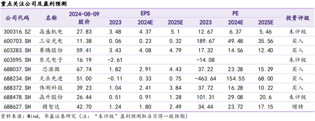 受益于上游头部供应商减产以及2023年第四季度消费电子市场有所恢复,存储芯片价格整体呈现回升趋势。NAND方面:Wafer:512GbTLC现货平均价从2023年7月底开始回升,2024年7月29日价格为3.25 美元。DRAM方面:DRAM:DDR4(8Gb(512Mx16),3200Mbps)现货平均价从2023年9月中旬开始持续上涨,2024年3月以来价格略有下滑,6月之后呈现小幅回升态势,8月9日价格为1.74 美元。