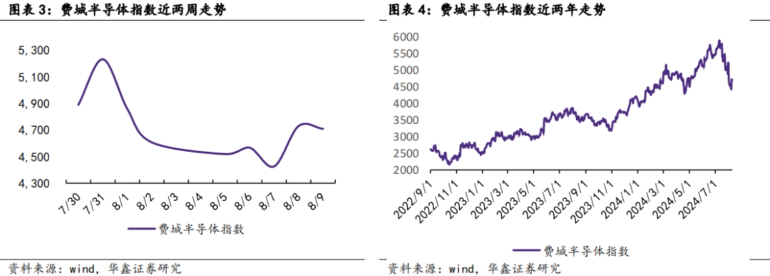 从数据来看,8月5日-8月9日当周,费城半导体指数总体呈现上涨态势,近两周整体处于先跌后涨态势。更长时间维度上来看,指数在进入 2022 年下行通道后,2023 年 1-6 月,复苏迹象明显,处于震荡上行行情;7 月以来处于下行行情;10 月底开始持续上涨。2024年上半年整体处于上升态势,在四月有所回调。