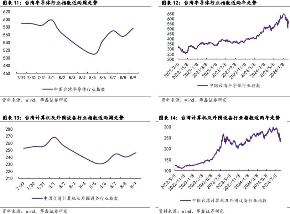 行业指标上,我们依次选取台湾半导体行业指数、台湾计算机及外围设备行业指数、台湾电子零组件行业指数、台湾光电行业指数,来观察行业整体景气。日期上,我们分别截取各指数近两周的日度数据、近两年的周度数据,来考察不同时间维度的变化。