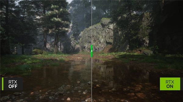 在游戏中,光追提高了光照、反射和阴影的保真度和质量,水面的倒影呈现了周围的所有细节,水的焦散进一步增强了真实感,准确地呈现了光的折射和反射。
