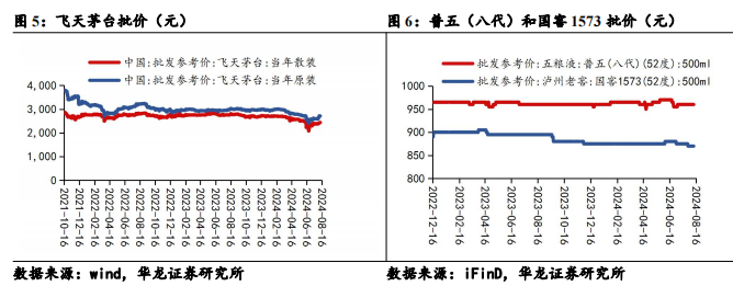上周(08月12日-08月16日)飞天茅台(散瓶)批价小幅抬升,从2435元/瓶上涨10元/瓶至2445元/瓶;飞天茅台(原装)批价同步上涨,从2695元/瓶上涨65元/瓶至2760元/瓶。五粮液(八代)批价维持960元/瓶。国窖1573批价维持870元/瓶。