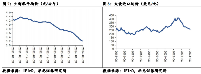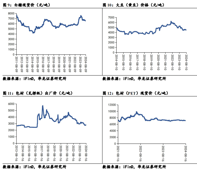 生鲜乳价格环比持平,暂停下跌,截至2024年8月9日,生鲜乳价格为3.21元/公斤;2024年6月大麦进口均价为262.28美元/吨,环比持续下降;2024年8月16日,白糖现货价格为6498元/吨,环比下降;2024年8月10日,大豆价格为4461.50元/吨,呈下降趋势;2024年8月16日,包材瓦楞纸出厂价维持2810元/吨;2024年8月16日,包材PET现货价为6920元/吨,呈下降趋势。
