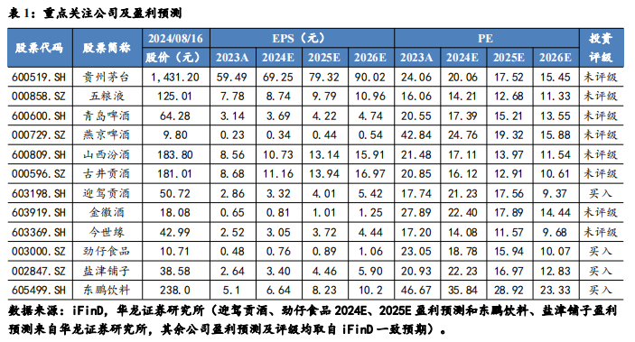 大众品:【啤酒】上半年,重庆啤酒实现营业收入88.61亿元,同比增长4.18%;归母净利润9.01亿元,同比增长4.19%;扣非后归母净利润8.88亿元,同比增长3.91%。其中,高档品实现营收52.63亿,同比增长2.82%;主流品实现营收31.74亿,同比增长4.37%;经济品实现营收1.86亿,同比增长11.45%,结构升级略承压。三季度啤酒行业受到雨水天气和餐饮疲软等因素影响较多,需求复苏不及预期。【软饮料】暑期消费旺季,瓶装水、功能型饮料、无糖茶、椰子水等软饮料需求旺盛,具备较高景气度,表现出较好增长趋势。【零食】零食板块渠道红利延续,量贩零食渠道和抖音等电商渠道呈现较快增长,暑期、中秋和国庆等出行场景火爆预计拉动终端需求。建议关注个股:青岛啤酒(600600.SH)、燕京啤酒(000729.SZ)、东鹏饮料(605499.SH)、劲仔食品(003000.SZ)、盐津铺子(002847.SZ)。