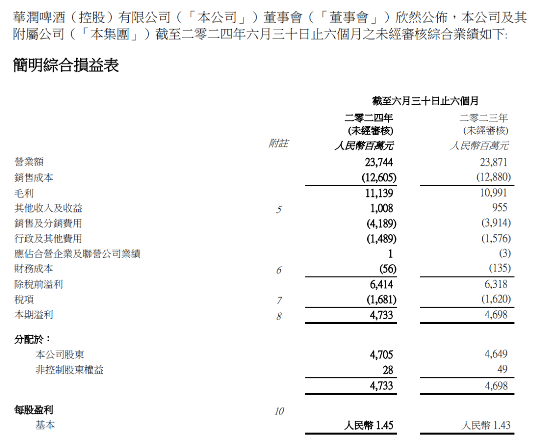 据华润啤酒披露未经审计的半年业绩,其中营业额(即营收)录得237.44亿元,数据与去年同期几乎持平,微跌0.53%,公司股东应占溢出利(即归母净利润)录得47.05亿元,较同期上升1.2%。