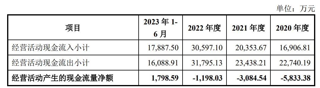 然而,其2020年、2021年及2022年各期末的经营活动产生的现金流量净额均处于告负状态,分别为-5,833.38万元、-3,084.54万元、-1,198.03万元。直至2023年上半年末,该数值才转正至1,798.59万元。
