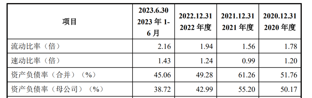 报告期各期末,斯比特的流动比率分别为1.78、1.56、1.94及2.16,速动比率分别为1.20、0.99、1.24及1.43,公司资产负债率(合并)分别为51.76%、61.26%、49.28%及45.06%。
