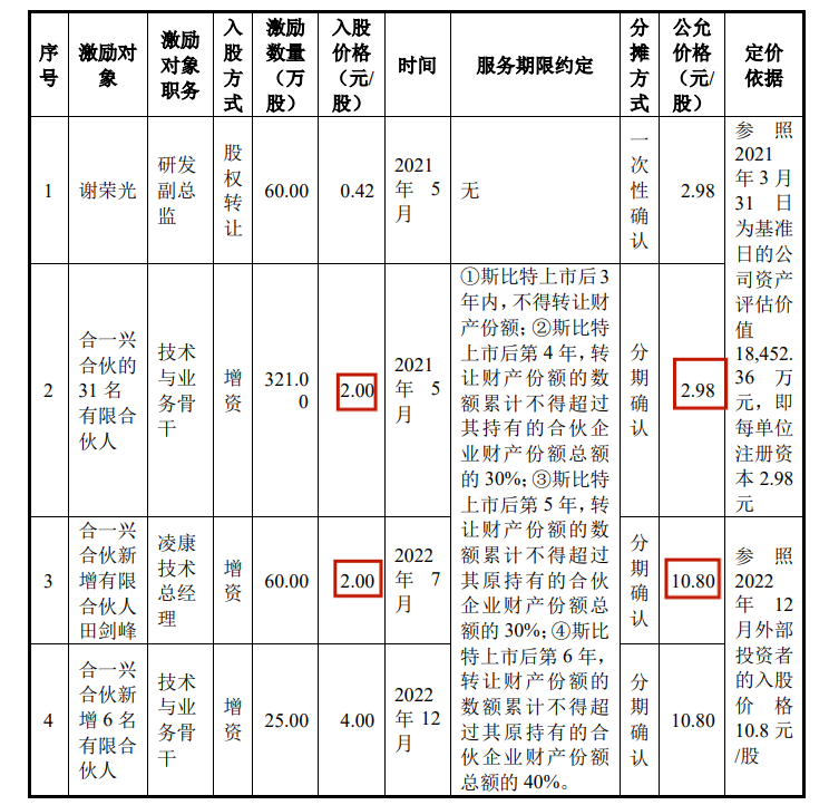 值得一提的是,不同于2021年5月(对象分别为谢荣光、合一兴合伙的31名有限合伙人)和2022年12月(对象为合一兴合伙新增6名有限合伙人)的股权激励,2022年7月进行的这次股权激励,激励对象仅有1人,为合一兴合伙新增有限合伙人田剑峰,其为斯比特全资子公司深圳市凌康技术有限公司(以下称“康技术”)的总经理,彼时以2元/注册资本的价格获得了60万股激励股份(对应注册资本60万元),但当时斯比特的股权公允价格为10.8元/股。