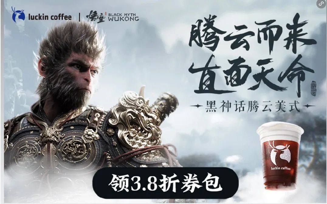 游戏之外,还有一场商业世界的狂欢。就在《黑神话:悟空》正式发售的前一天,“泼天流量”率先砸在瑞幸上——瑞幸咖啡与《黑神话:悟空》联名产品“黑神话腾云美式咖啡”上线,限量赠送联名杯套等周边产品。