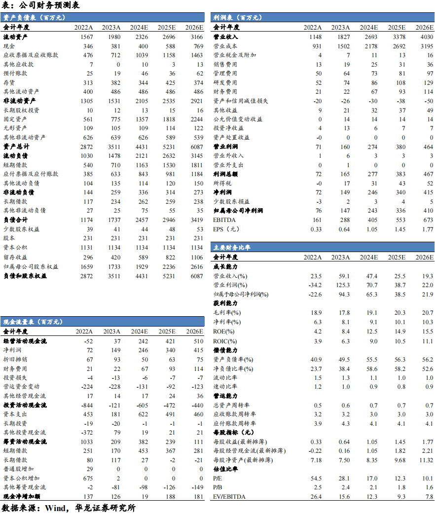 规模效应驱动毛利率同/环比增长,期间费用率提升或系扩张期支出增加。随着公司主营业务出货量提升,规模效应凸显,推动2024Q2毛利率同/环比+2.14pct/+0.88pct至19.47%。2024Q2公司期间费用率同比+1.92pct,我们认为主要系公司目前处于产能&订单扩张期,相应支出增加。其中销售费用率同比+0.51pct,主要系销售规模增长下计提的三包费用增加;财务费用率增加主要系银行借款对应利息增加;研发费用率同比+0.93pct,主要系公司加大研发投入,报告期内公司新增39项授权专利技术。