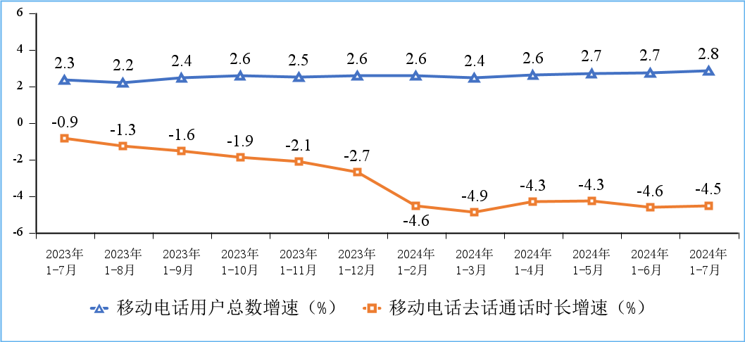 电话通话量小幅下降,移动短信量收平稳增长。1—7月份,移动电话去话通话时长完成12518亿分钟,同比下降4.5%;固定电话主叫通话时长完成450.7亿分钟,同比下降2.1%。1—7月份,全国移动短信业务量同比增长1%;移动短信业务收入同比增长1.6%。