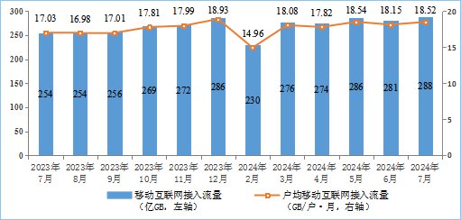 移动互联网流量保持较快增长,7月DOU值处于高位。1—7月份,移动互联网累计流量【见注1】达1891亿GB,同比增长12.6%,增速与上半年持平。截至7月末,移动互联网用户数【见注1】达15.58亿户,比上年末净增3361万户。7月当月户均移动互联网接入流量(DOU)达到18.52GB/户·月,同比增长8.7%,比上年同期提升1.49GB/户·月。