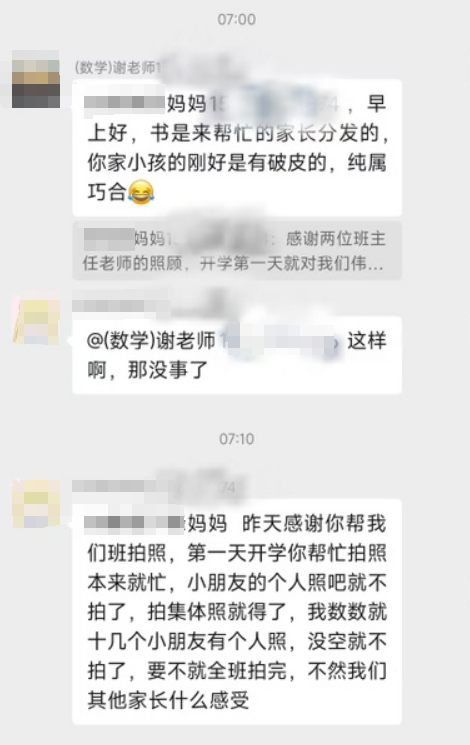 该班级的一名家长刘某在微信群投诉称,自家孩子新学期领到的书本是破损的、开学摄影留影没有单独照片、家长咨询有关辅导一事遭班主任怠慢,以及家人放学接孩子迟到被老师训斥等。