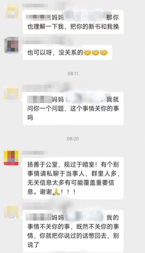 网络流传聊天记录显示,深夜12点20分左右,刘某在班级家长微信群发布消息称,孩子领到的书本是破损的,并表示:“实在没有书换的就算了,不用换了,我上公众号说一下,老师这么照顾我们家孩子。”