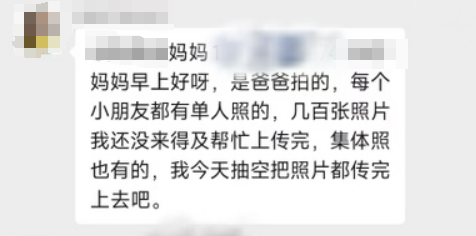 后来,拍照的家长称,是因为照片太多,没有来得及上传。刘某表示是自己误会了,表达了歉意。