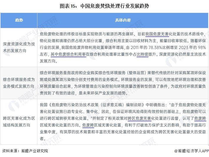 危废处理有“无害化”、“减量化”和“资源化”三大原则,这势必要求危废焚烧处理行业技术上发展深度资源化、业务上向综合环境服务转型以及区域结构上发展跨区无害化处理等趋势::