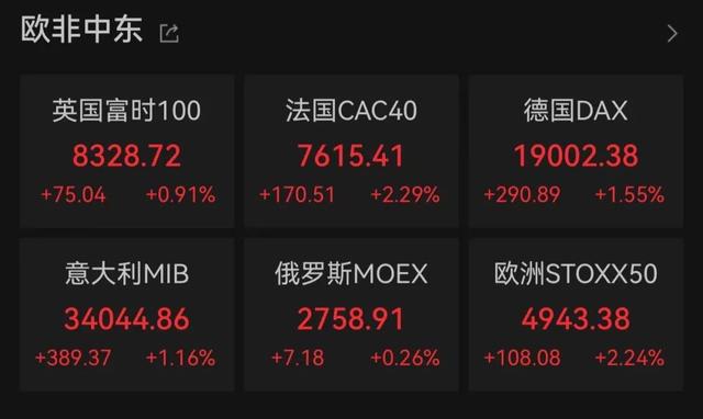 德国DAX指数涨1.55%报19002.38点,法国CAC40指数涨2.29%报7615.41点,英国富时100指数涨0.91%报8328.72点。