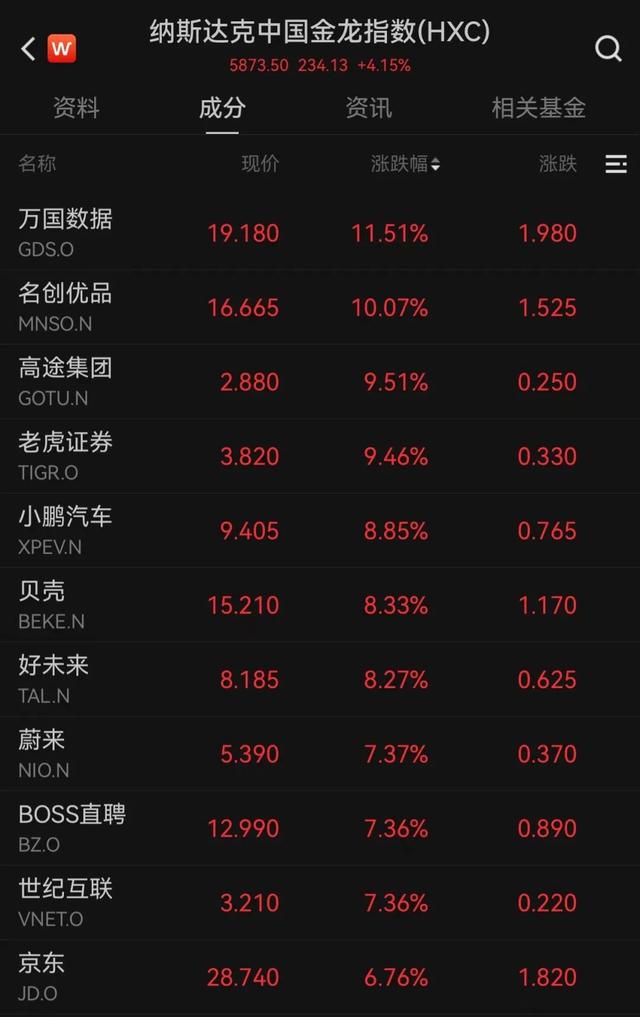 昨夜美股中,热门中概股普涨,纳斯达克中国金龙指数涨4.15%。