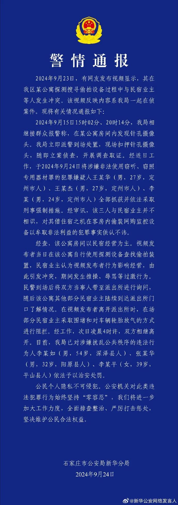 9月24日晚,河北省石家庄市公安局新华分局发布警情通报称,安装针孔摄像头的三名犯罪嫌疑人已被抓获并采取刑事强制措施。通报中提到,三人与民宿业主并不相识。通报同时提到,围堵和阻拦博主离开三名行为人被依法予以治安处罚。