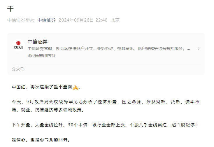9月26日晚间,中信证券研究在公司官号发布文章刷屏,标题仅一个字:干。