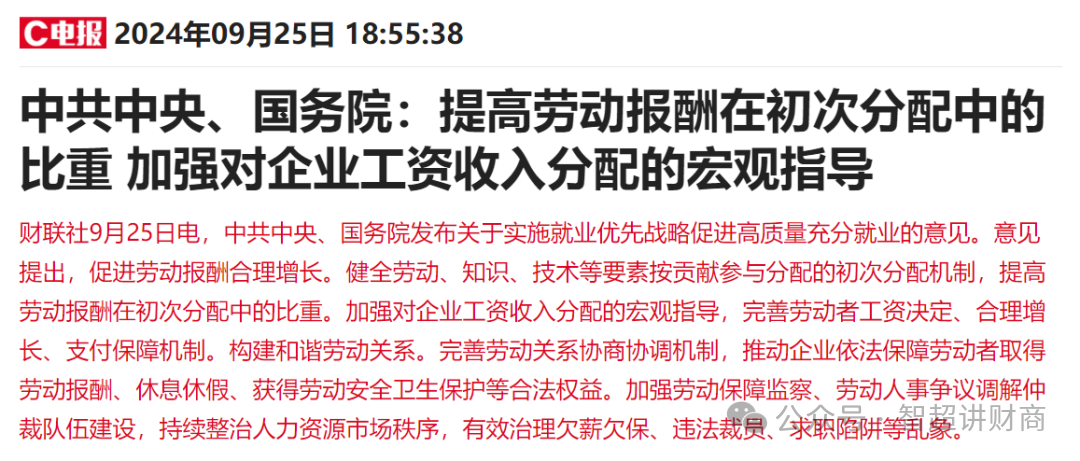 9月25日,《中共中央、国务院关于实施就业优先战略促进高质量充分就业的意见》发布,提出了24条举措。促进劳动报酬合理增长。健全劳动、知识、技术等要素按贡献参与分配的初次分配机制,提高劳动报酬在初次分配中的比重。加强对企业工资收入分配的宏观指导,完善劳动者工资决定、合理增长、支付保障机制。